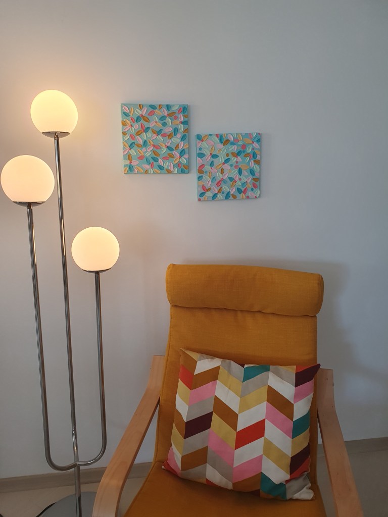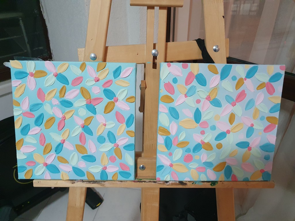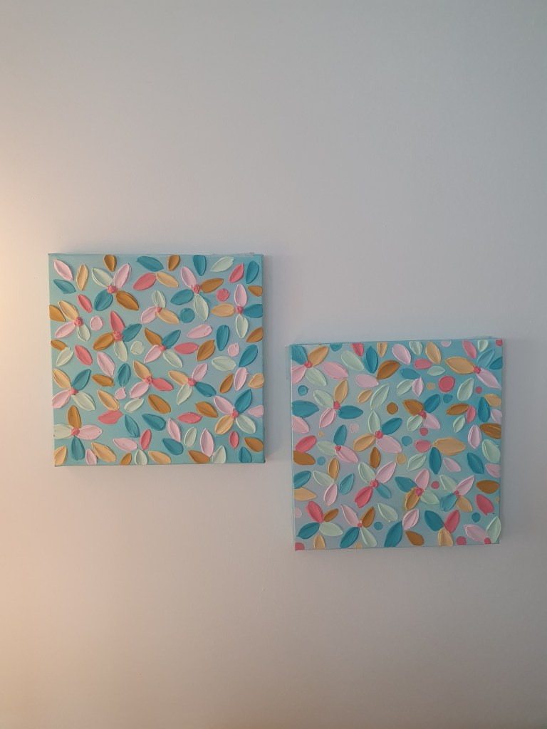 - Set of two texture flower paintings on canvas, each 20 cm x 20 cm.