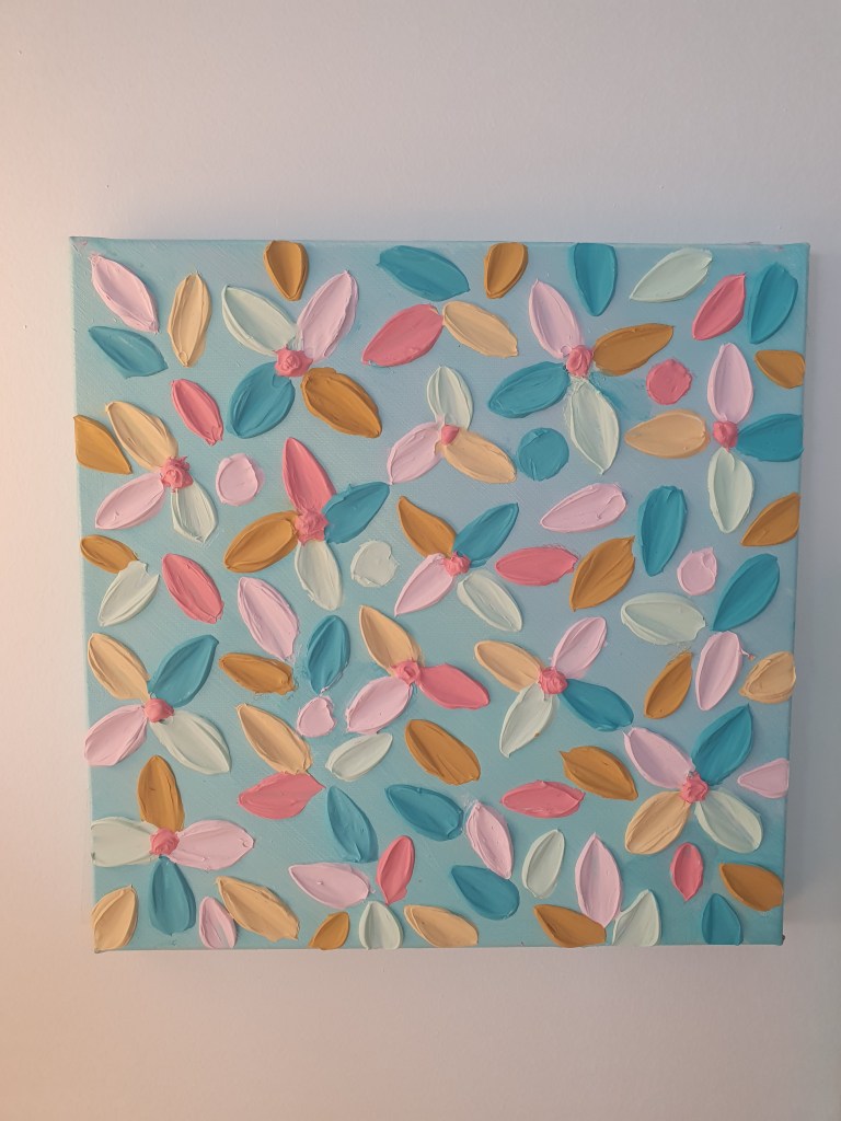 This artwork is a captivating set of texture flower paintings, meticulously crafted by blending acrylic paint with a thickening paste to create a rich, tactile surface. The collection comprises two separate pieces, each measuring 20 cm x 20 cm, elegantly presented on canvas.