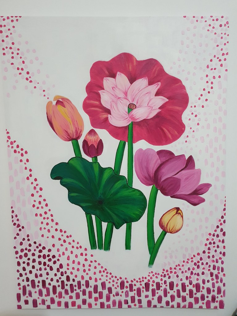 - Acrylic painting of lotus flowers on a 75 cm x 60 cm canvas.